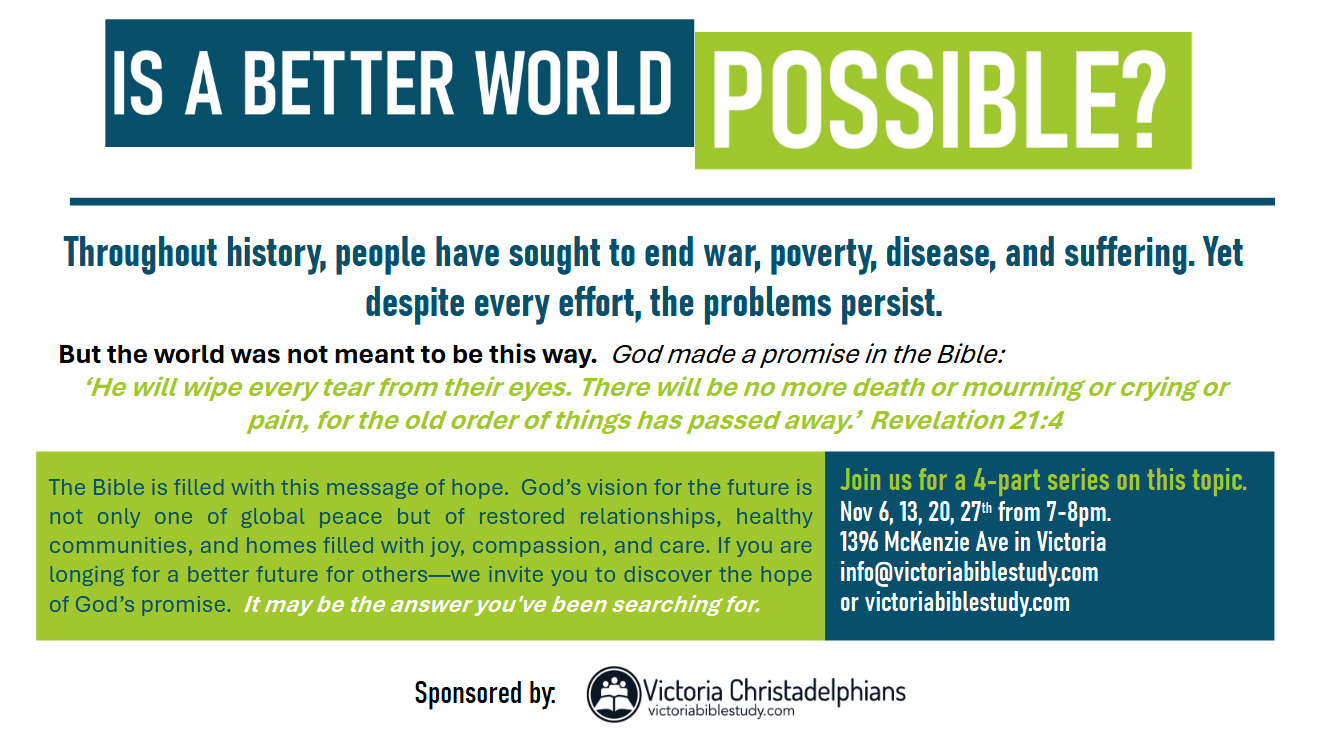 A Better World A Bible Seminar – starting November 6th, 2025 Download seminar course outline For more information, please contact us.